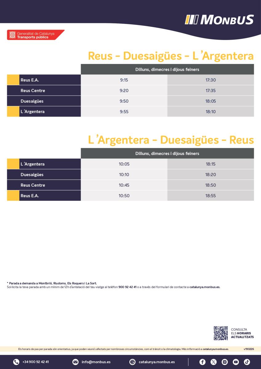 Matí: Estació d’autobusos 09:15 → Reus Centre (Biblioteca) 09:20 → Duesaigües 09:50 → l’Argentera 09:55